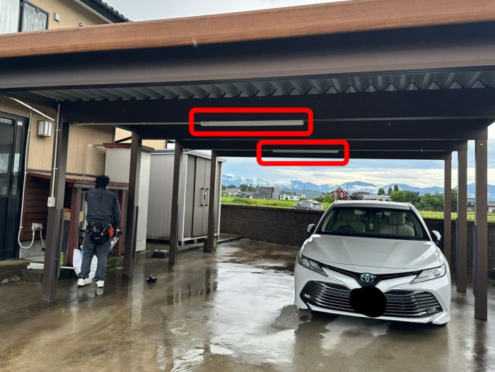 2台のLED照明が放つ光で、カーポートの隅々までくっきりと見えるようになりました。