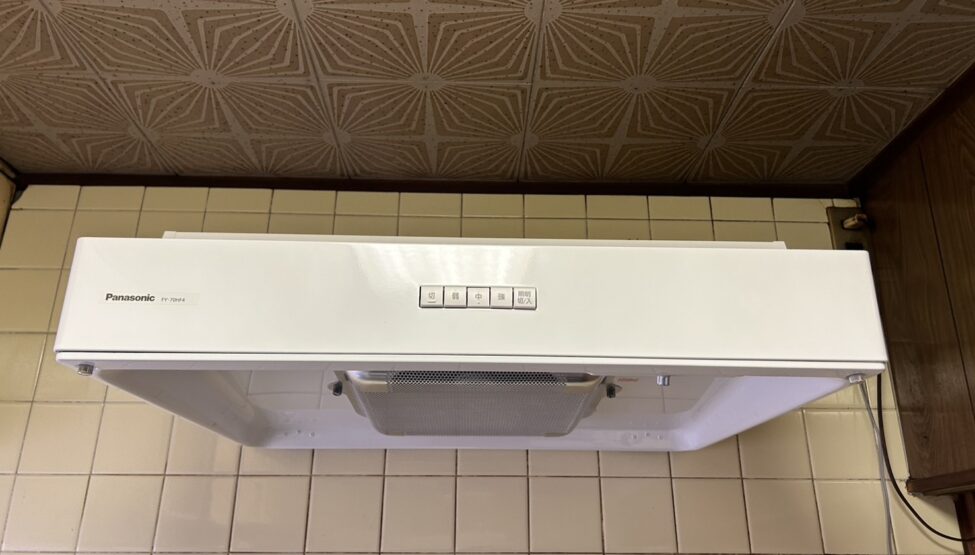 現地で既存のナショナル製レンジフードを確認したところ、20年近くの使用による汚れや部品劣化が見られました。寸法や取り付け状況、電気配線の状態を調査した上で、交換機種として「パナソニックのFY-70HF4」を提案。ターボファン搭載で吸引力が高く、風圧式逆流防止シャッター付きのため、安全で効率的な換気が可能です。調査後、お見積りをご提示し、正式にご依頼いただきました。