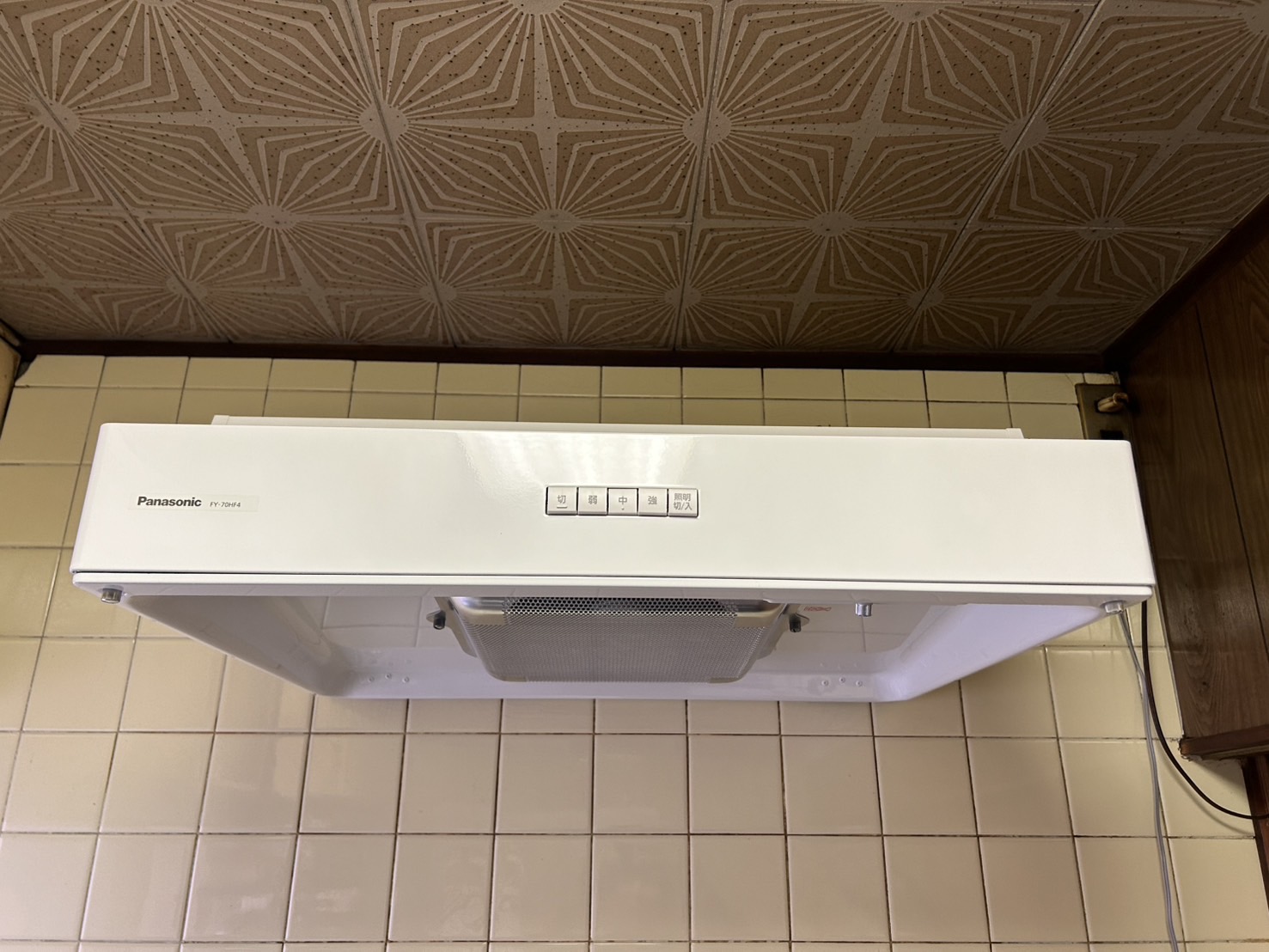 現地で既存のナショナル製レンジフードを確認したところ、20年近くの使用による汚れや部品劣化が見られました。寸法や取り付け状況、電気配線の状態を調査した上で、交換機種として「パナソニックのFY-70HF4」を提案。ターボファン搭載で吸引力が高く、風圧式逆流防止シャッター付きのため、安全で効率的な換気が可能です。調査後、お見積りをご提示し、正式にご依頼いただきました。